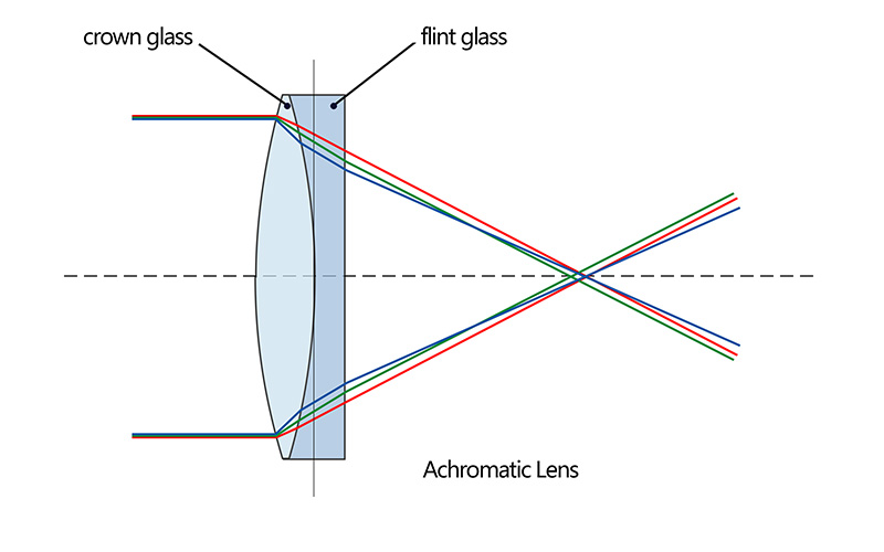 The most common type of achromat is the achromatic doublet, which is composed of two individual lenses made from glasses with different amounts of dispersion. Typically, one element is a negative (concave) element made out of flint glass such as F2, which has relatively high dispersion, and the other is a positive (convex) element made of crown glass such as BK7, which has lower dispersion. The lens elements are mounted next to each other, often cemented together, and shaped so that the chromatic aberration of one is counterbalanced by that of the other.